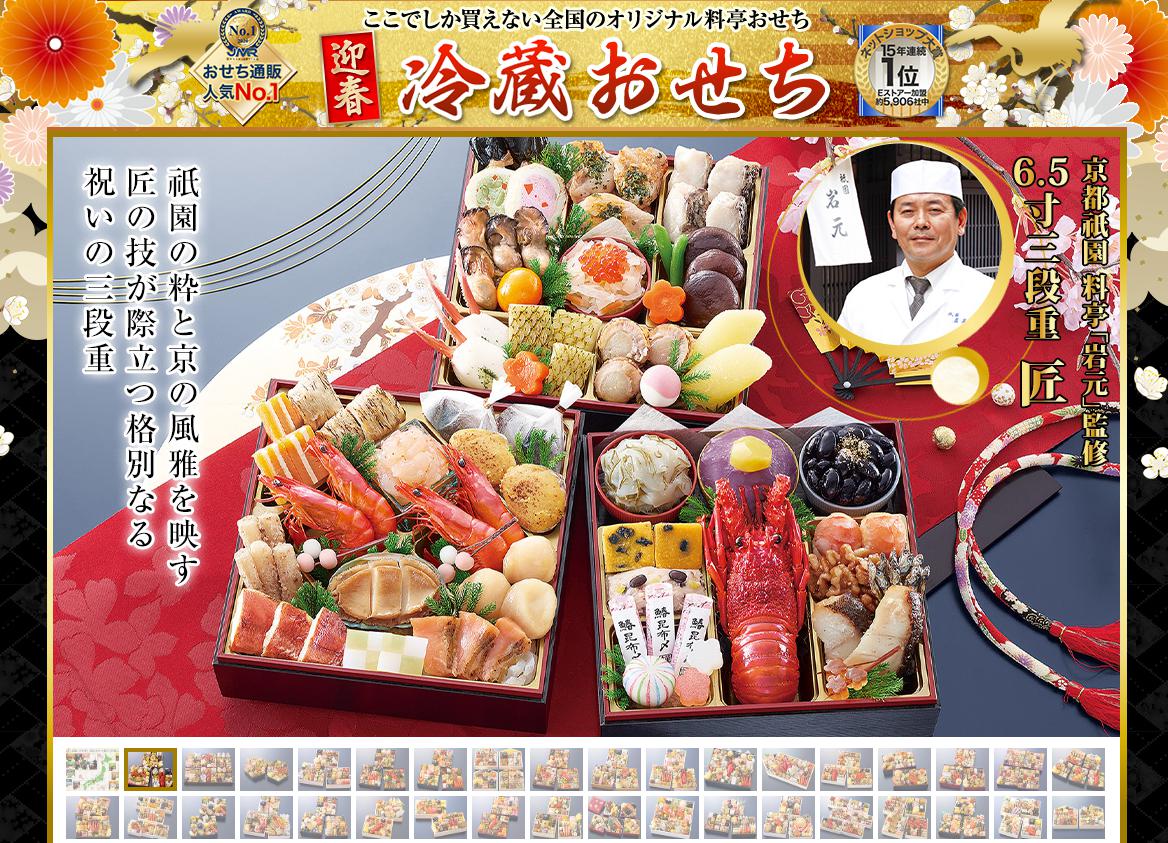 公式サイトはこちら 匠本舗は、話題の料亭・名店の大人気のおせち通販サイトです。 京都・祇園花見小路にある料亭「岩元」が監修した、匠本舗のおせちです。 壱の重には「ロブスター旨煮」「合鴨スモーク」、参の重には「銀鱈西京焼き」「牡蠣時雨煮」。 伍の重には「蟹甲羅焼き」「金目鯛炙り焼き」などが入っています。 本商品でしか味わえない料理を楽しめるのも特徴です。 岩元 おせちは、非常に人気ですぐに売り切れてしまいますので、お早めのご予約をおすすめします。 お正月は、美味しいおせちを、是非お召し上がりください! 商品名 岩元 おせち 【匠本舗】(し) カテゴリ おせち